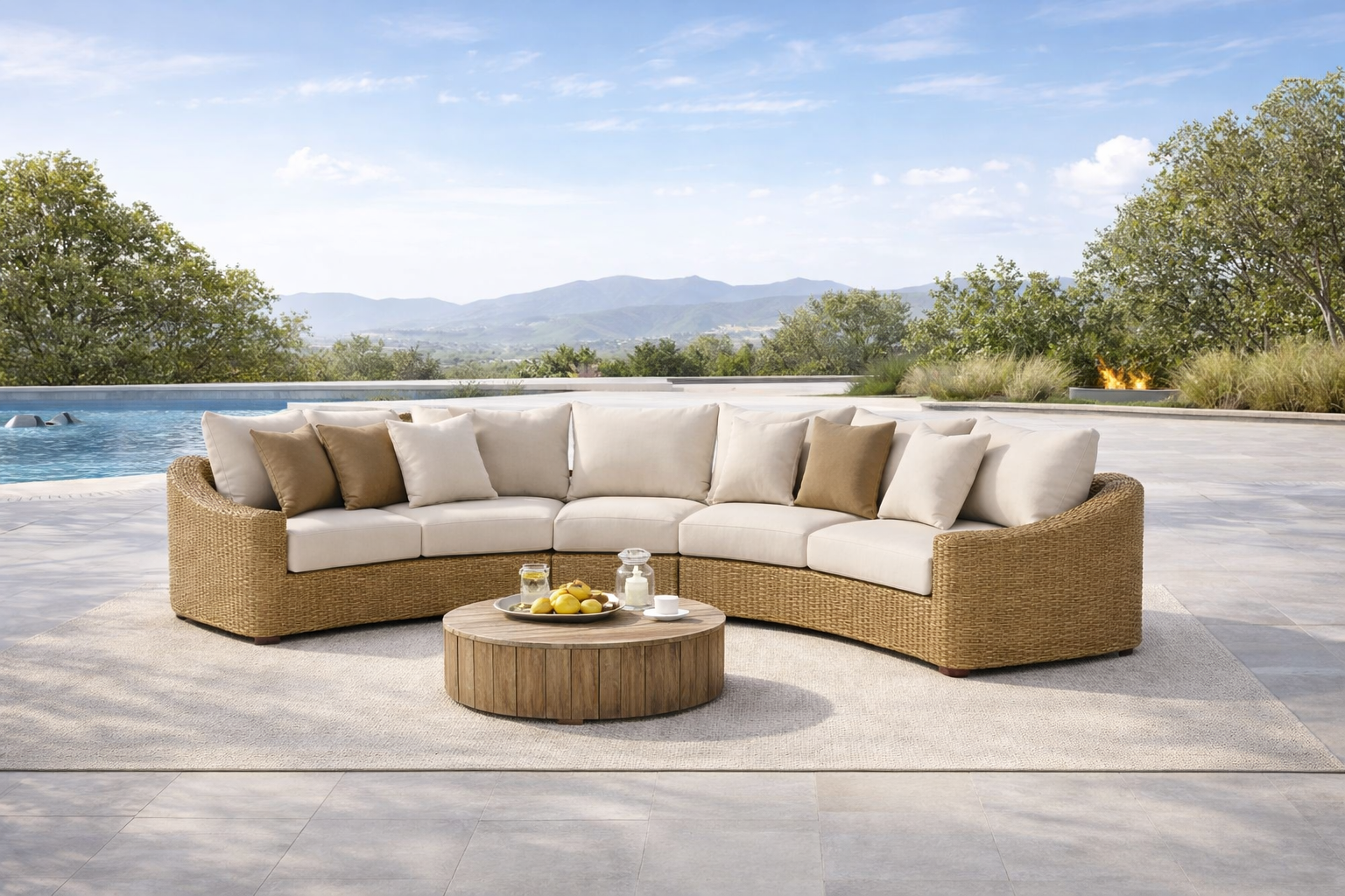 Constructed with resin wicker and a curved sectional layout, suitable for patios, gardens, and other outdoor spaces. The clean overall form supports everyday outdoor use and casual arrangements.
